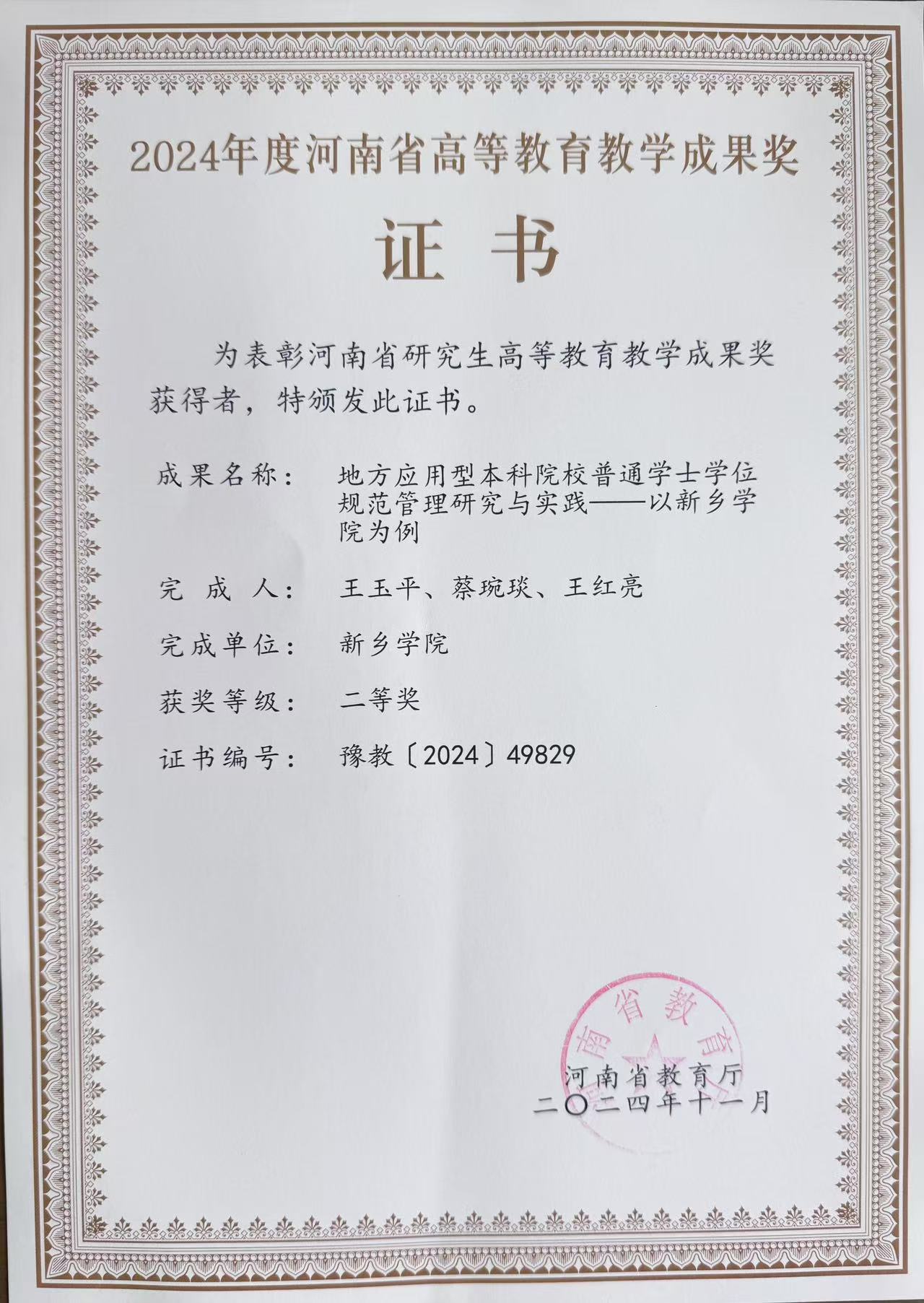 教科研项目 当前位置: 首页 >> 教科研成果 >> 教科研项目 >> 正文 2024年度河南省高等教育教学成果奖等奖——地方应用型本科院校普通学士学位规范管理研究与实践——以新乡学院为例 日期:2025年08月15日 18:15 浏览次数:次 上一条:近五年教学研究项目 下一条:近五年已授权专利 【关闭】